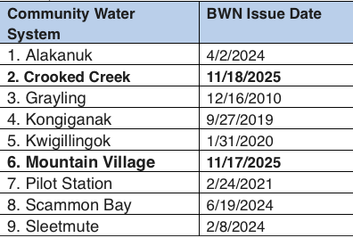 The community water systems in the Yukon-Kuskokwim Delta listed below are currently under Boil Water Notice, issued by the State of Alaska Drinking Water Program, as of the date noted above.