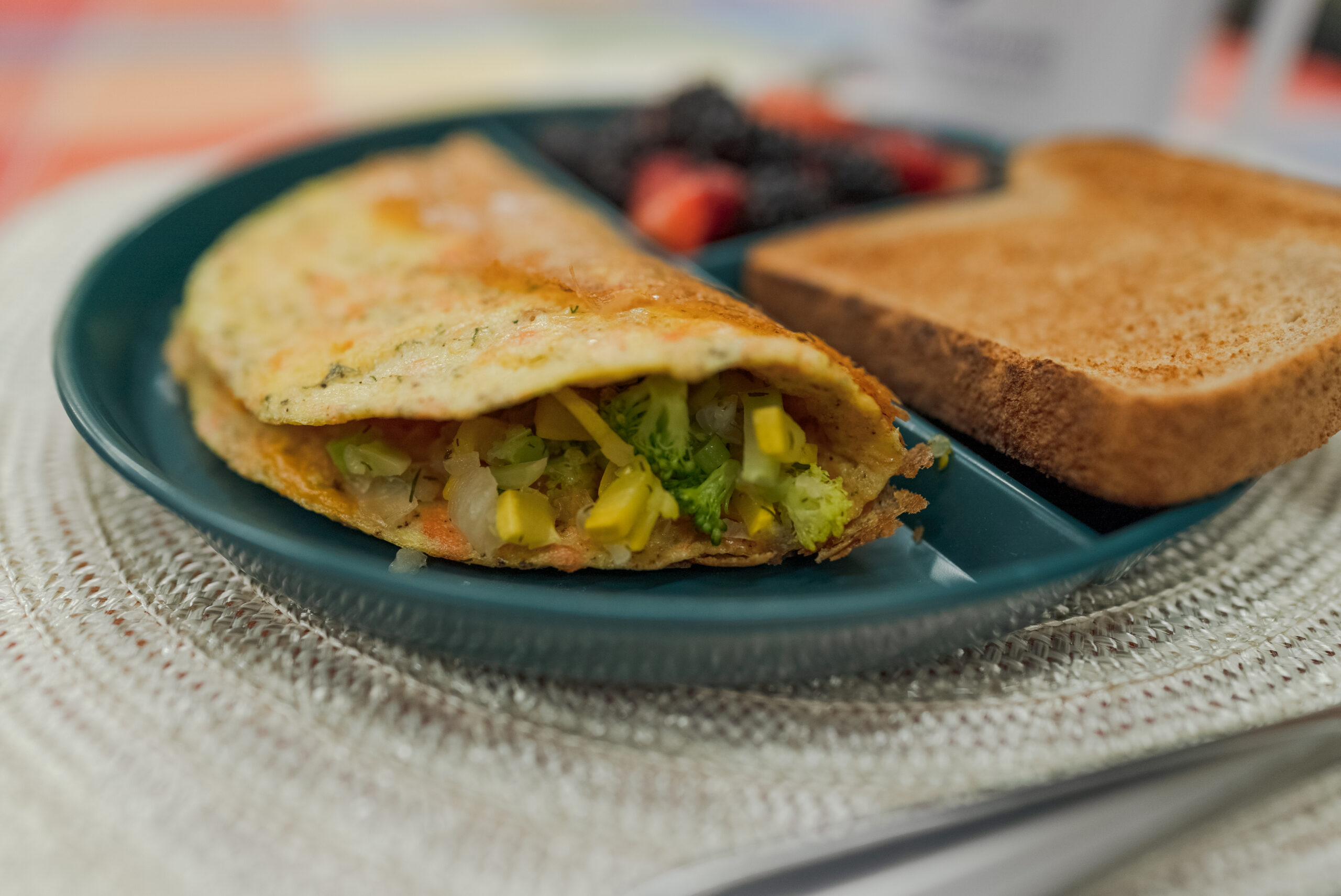 INGREDIENTS: 4 teaspoons canola oil, 2 teaspoons for vegetables, 1 teaspoon for cooking each omelet 3/4 cup finely chopped broccoli 3/4 cup finely chopped zucchini